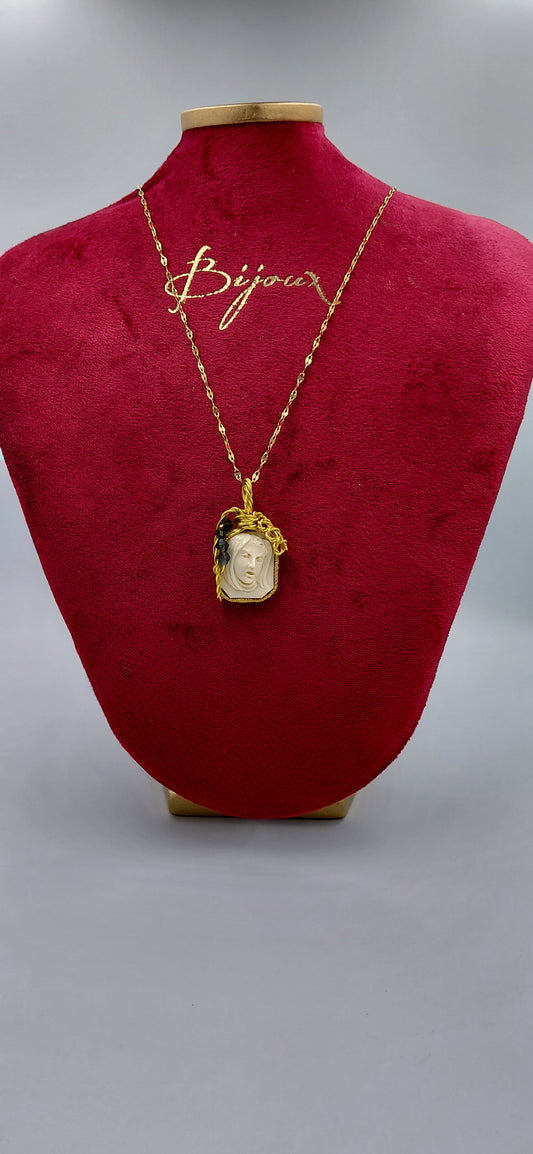 Cammeo " Gorgona" inciso a mano in pasta di corallo colore avorio incastonato in metallo con tecnica wire