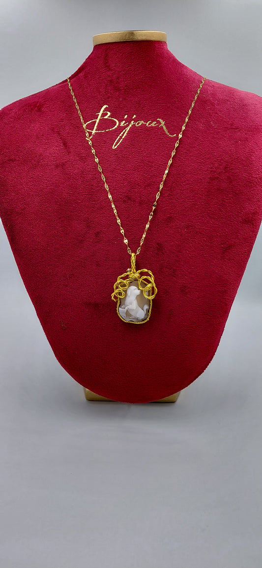 Cammeo " angioletto con uccellino " in conchiglia sardonica incastonato in metallo con tecnica wire