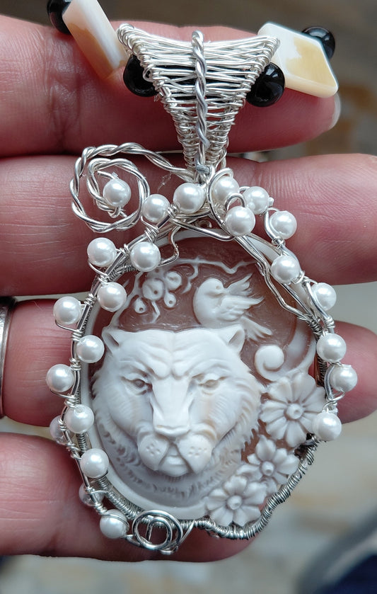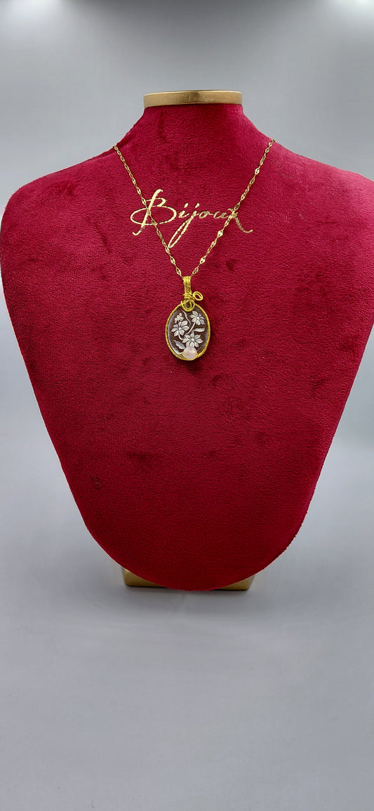 Cammeo"fiori "conchiglia sardonica incastonato in metallo con tecnica wire