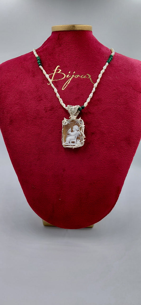 Cammeo " Primavera " conchiglia sardonica incastonato in metallo con tecnica a filo wire