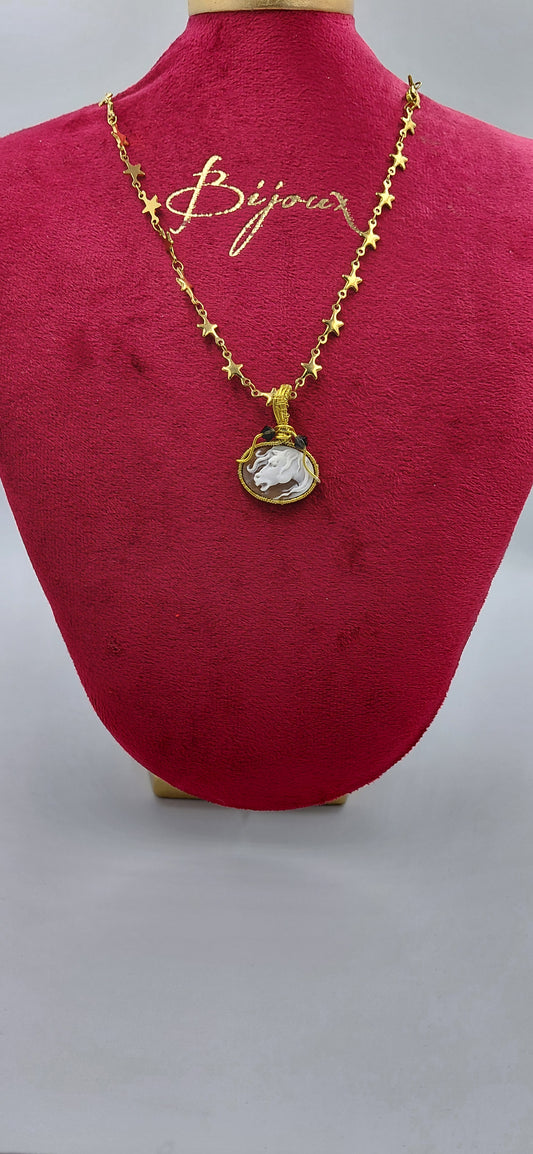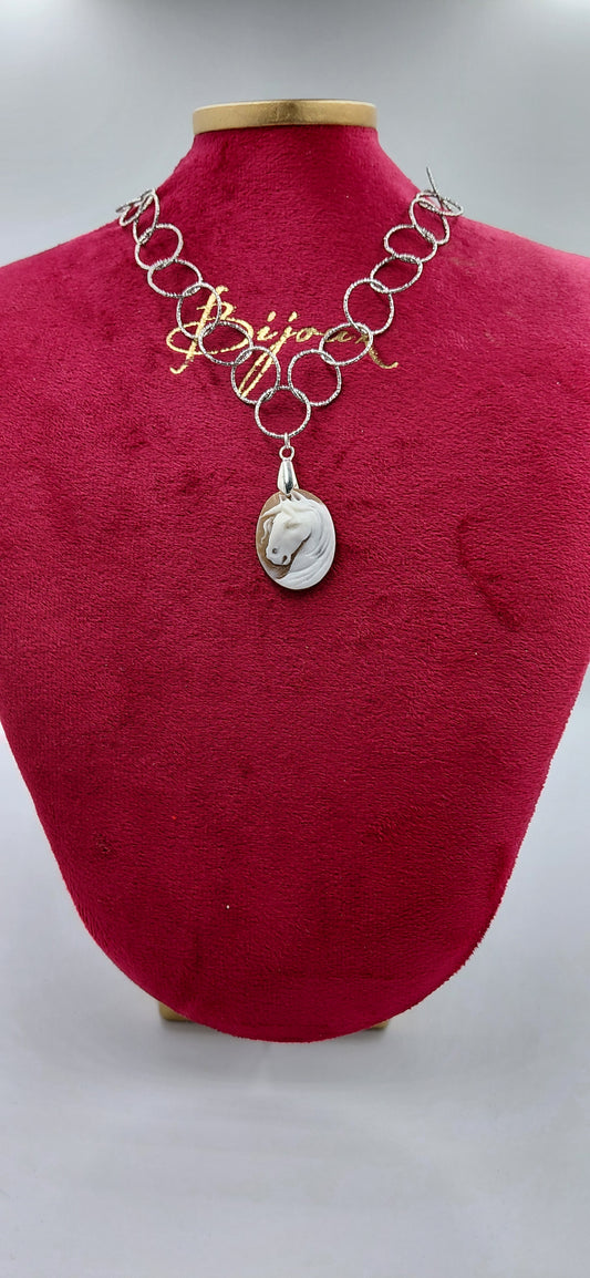 cammeo "Testa di cavallo " in conchiglia sardonica incastonato in metallo con tecnica wire