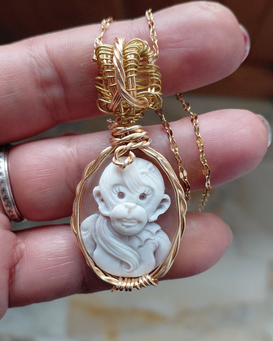 Cammeo " Scimmietta "conchiglia sardonica incastonato in metallo con tecnica a filo wire