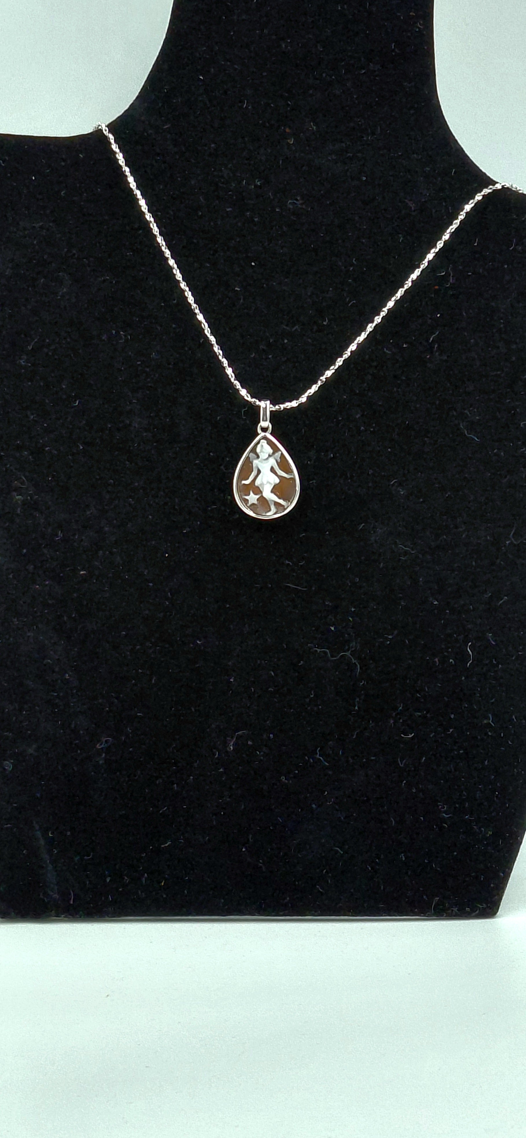 Questo raffinato cammeo "Fatina", inciso a mano da un esperto incisore di Torre del Greco, è realizzato su conchiglia sardonica e montato su argento 925. Con un cammeo di 16 mm e un ciondolo di 24 mm, rappresenta un'elegante espressione dell’arte artigianale italiana, ideale per chi cerca un gioiello unico dal valore artistico e tradizionale.