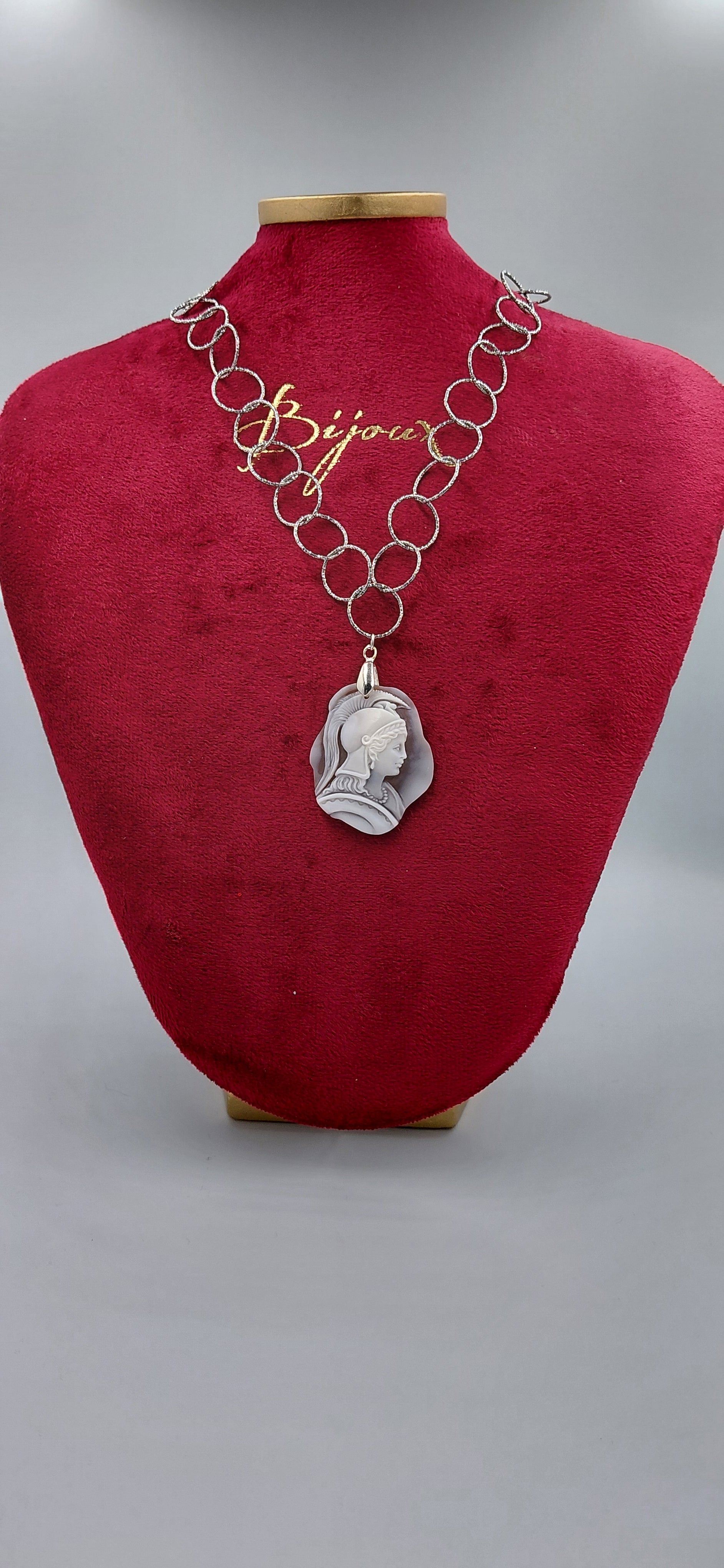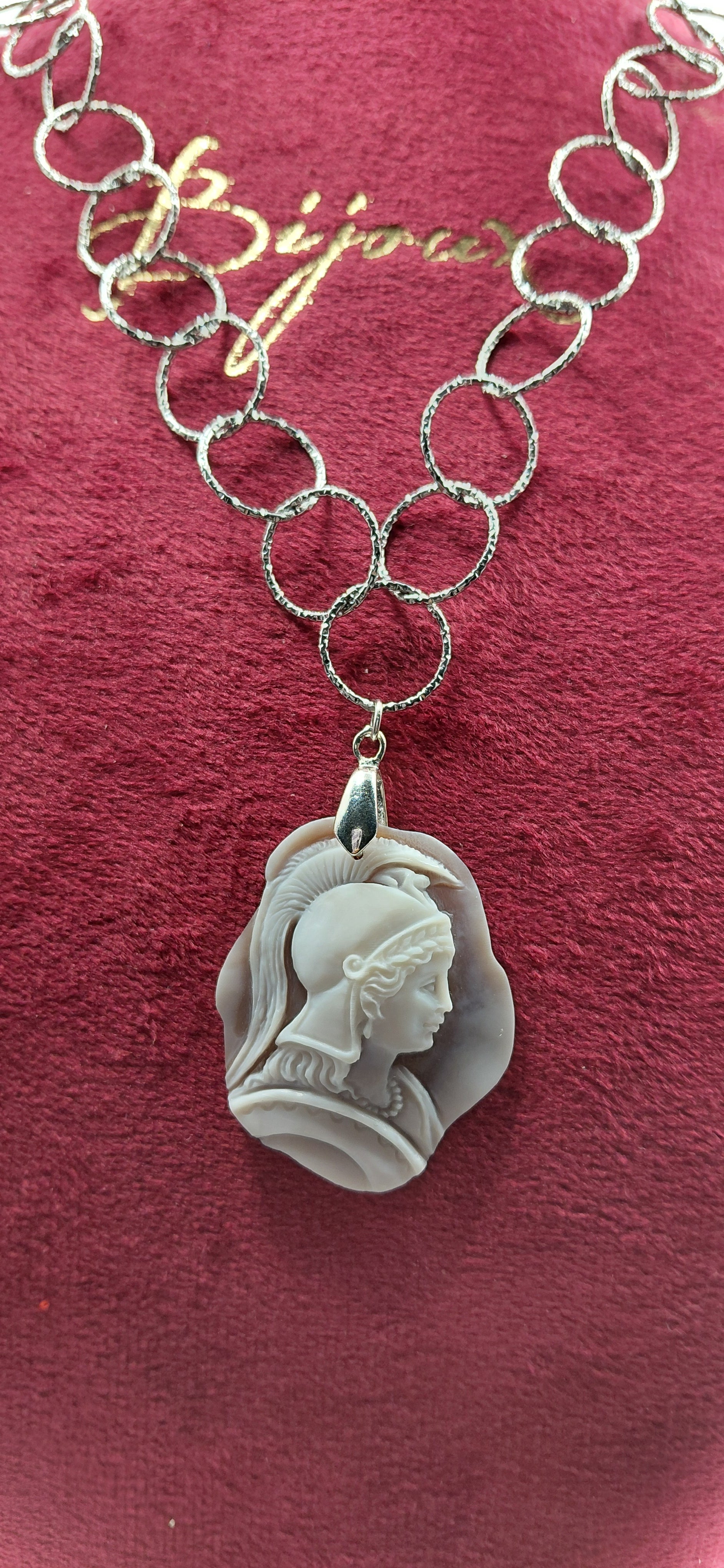 Cammeo "Minerva" da 37 mm, inciso a mano dal nostro maestro incisore di Torre del Greco. Realizzato in pregiata conchiglia sardonica, questo pezzo cattura i dettagli raffinati della dea della saggezza con la tecnica tradizionale italiana. La collana in metallo misura 50 cm con estensione di 5 cm, perfetta per adattarsi a diversi stili e occasioni. Un'opera artigianale autentica che unisce bellezza classica e maestria senza tempo.