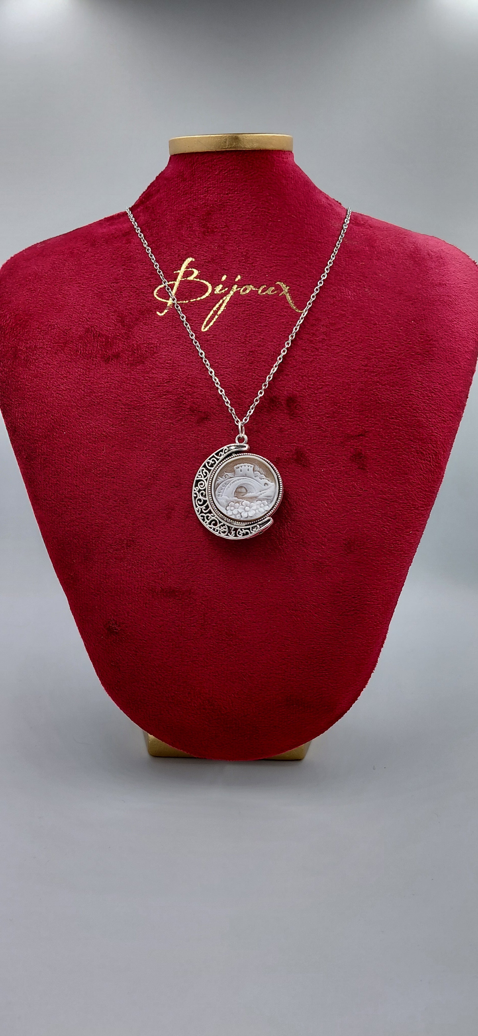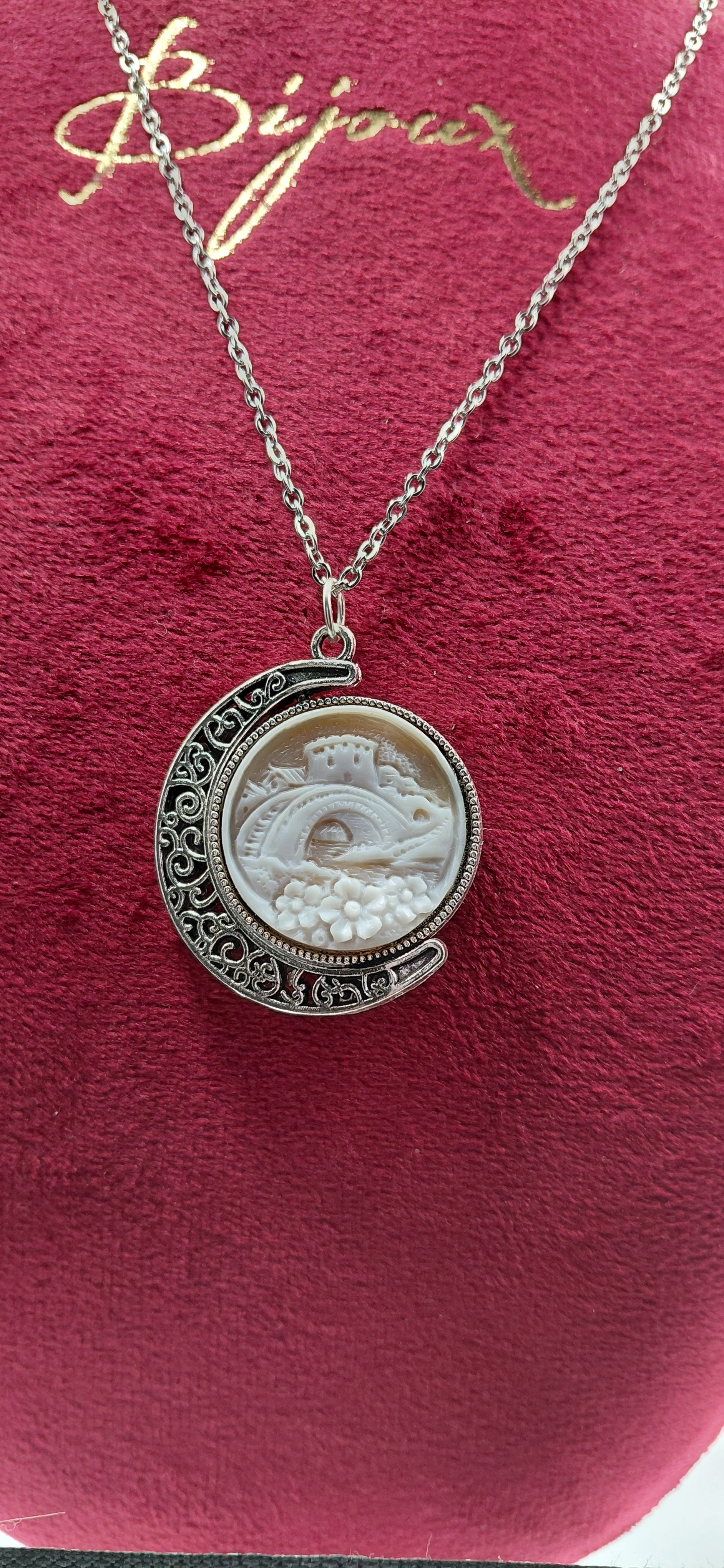 Raffinato cammeo da 25 mm realizzato in conchiglia sardonica, interamente inciso a mano secondo la tradizione artigianale italiana. La composizione paesaggistica cattura dettagli naturali con straordinaria precisione, esaltati dal contrasto cromatico della sardonica. Montatura in metallo di qualità garantisce durabilità e eleganza senza tempo. Completo di esclusiva catenina in metallo da 45 + 5 cm, ideale come regalo sofisticato per chi apprezza l'arte della glittica e l'artigianalità autentica.