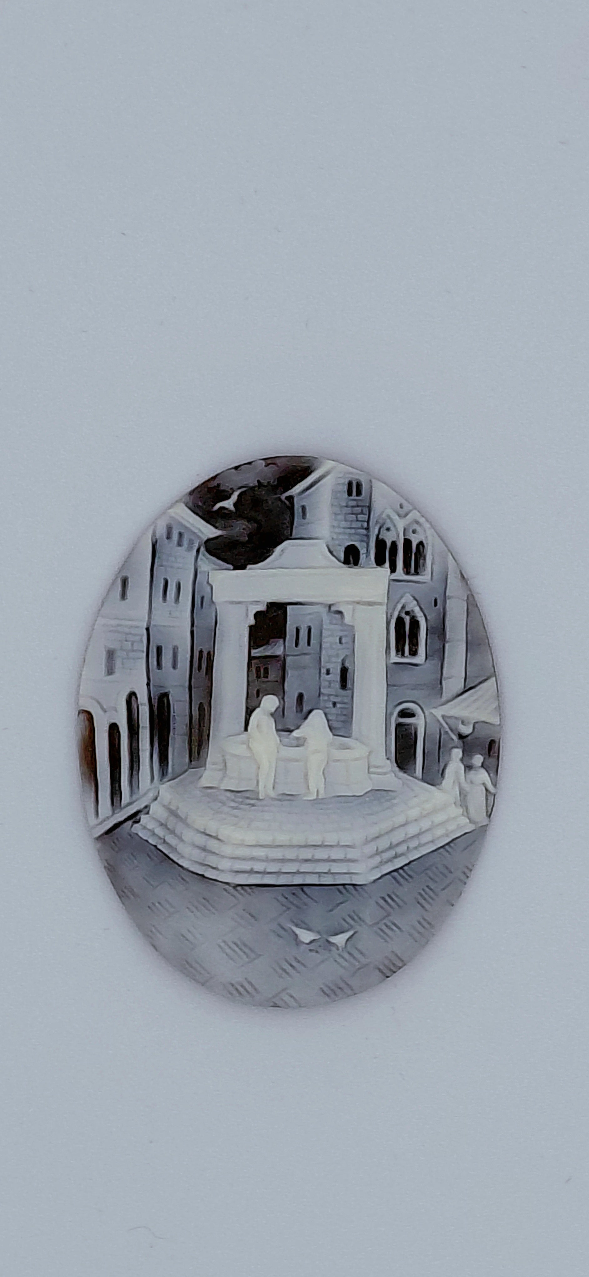 Cammeo "SAN GIMIGNANO PIAZZA DELLA CISTERNA " conchiglia sardonica cassis madagascariensis , manifattura artigianale di Torre del Greco , lavorazione artigianale molto accurata e luminosa. Cammeo di forma ovale misura altezza50 mm larghezza39.Questa incisione in microscultura fatta con le sapienti mani dell'artista, trasforma la conchiglia in una minuziosa opera d'arte. Prezzo e senza montatura e alla vostra richiesta si può anche montare al vostro piacimento come spilla,ciondolo.Questi cammei rappresentano una lavorazione artigianale esclusivamente fatta a mano, per questo non ci sarà mai un pezzo uguale ad un altro,quindi diventano pezzi unici
