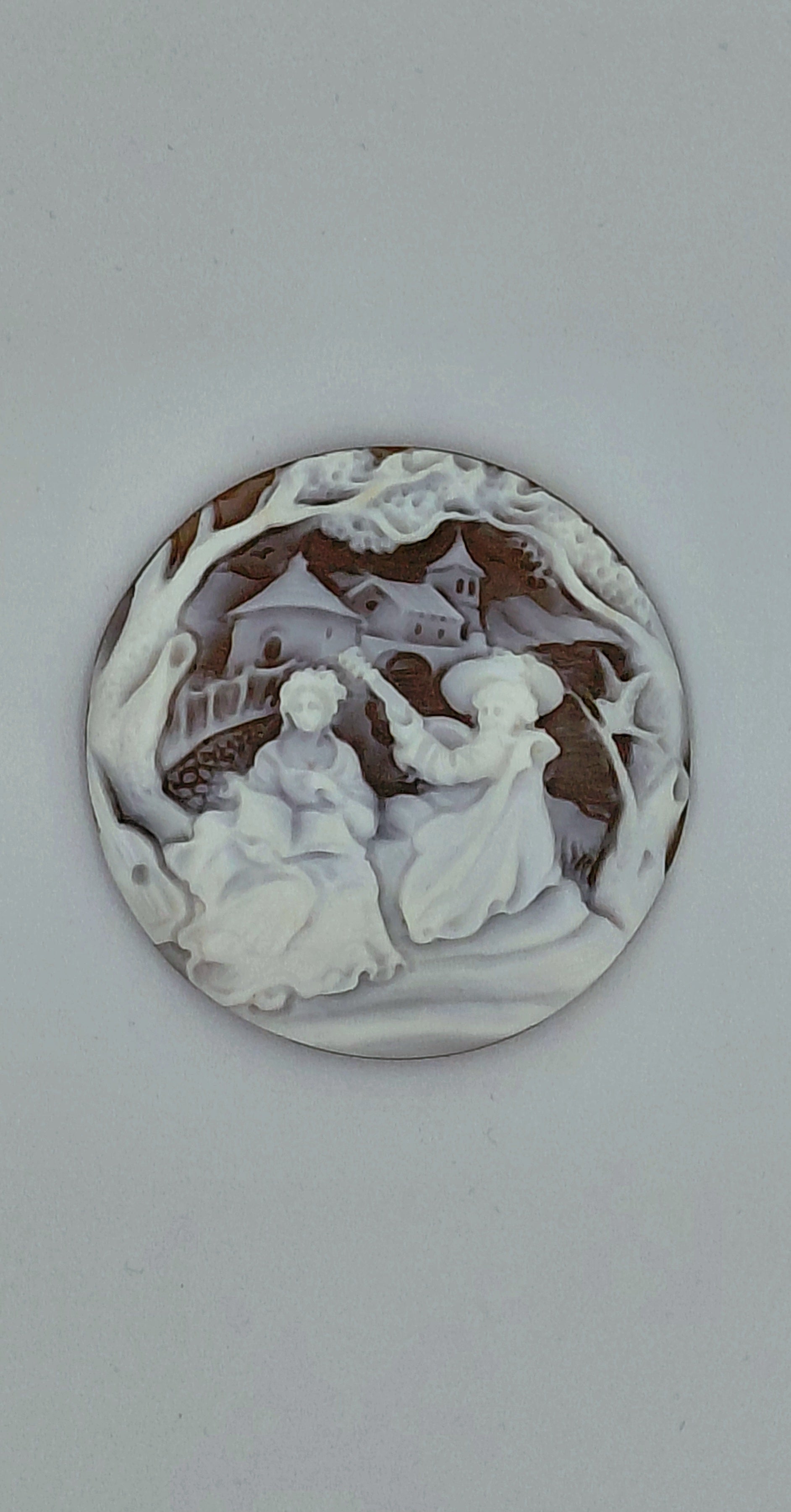 Cammeo " SCENA ROMANTICA" conchiglia sardonica cassis madagascariensis , manifattura artigianale di Torre del Greco , lavorazione artigianale molto accurata e luminosa. Cammeo di forma rotonda misura 45 mm .Questa incisione in microscultura fatta con le sapienti mani dell'artista, trasforma la conchiglia in una minuziosa opera d'arte. Prezzo e senza montatura e alla vostra richiesta si può anche montare al vostro piacimento come spilla,ciondolo, .Questi cammei rappresentano una lavorazione artigianale esclusivamente fatta a mano, per questo non ci sarà mai un pezzo uguale ad un altro,quindi diventano pezzi unici .