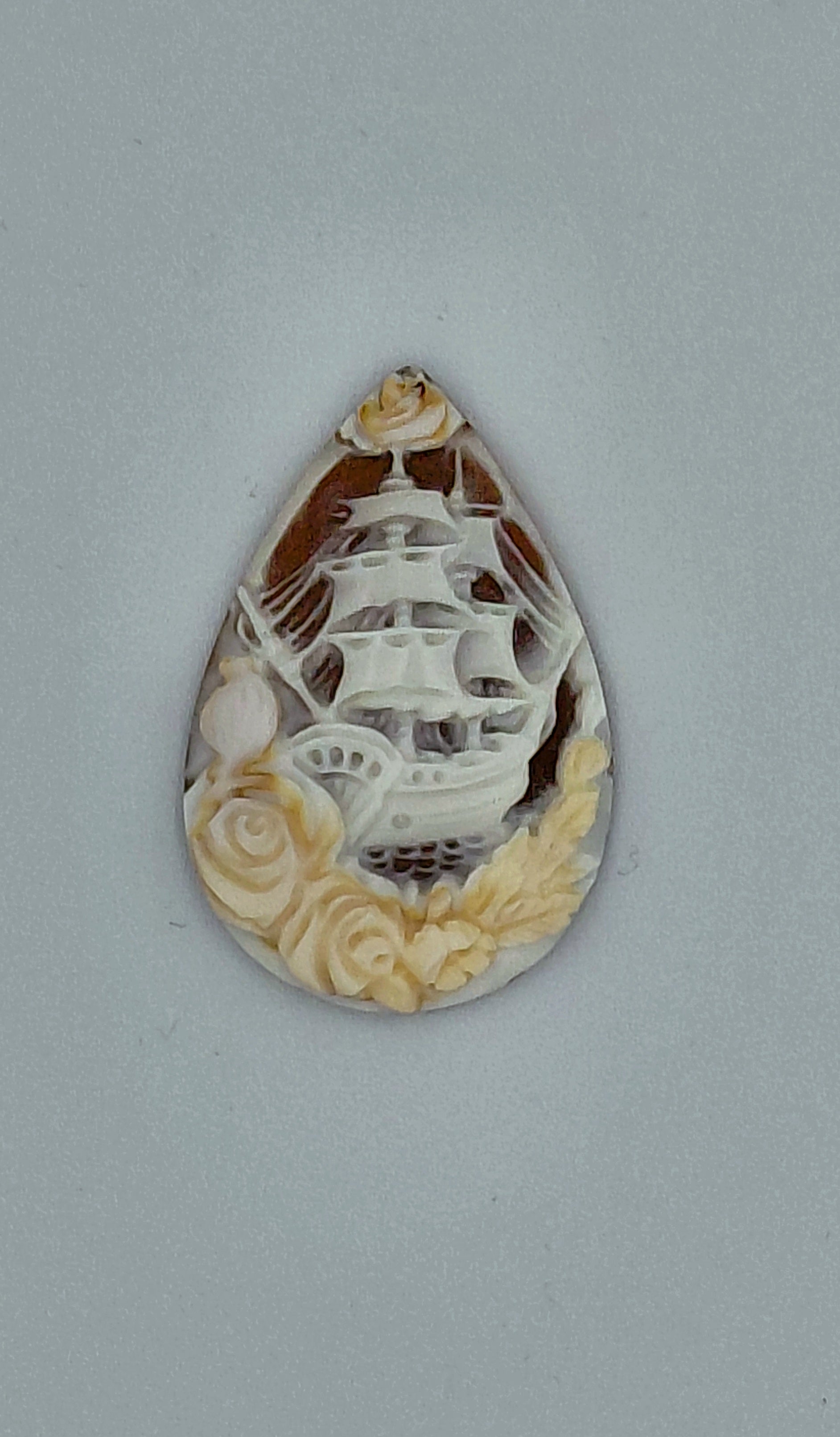 Cammeo "VELIERO CON FIORI" conchiglia sardonica cassis madagascariensis , manifattura artigianale di Torre del Greco , lavorazione artigianale molto accurata e luminosa. Cammeo di forma a goccia misura altezza 40 larghezza 26 mm .Questa incisione in microscultura fatta con le sapienti mani dell'artista, trasforma la conchiglia in una minuziosa opera d'arte. Prezzo e senza montatura e alla vostra richiesta si può anche montare al vostro piacimento come spilla,ciondolo . Questi cammei rappresentano una lavorazione artigianale esclusivamente fatta a mano, per questo non ci sarà mai un pezzo uguale ad un altro,quindi diventano pezzi unici