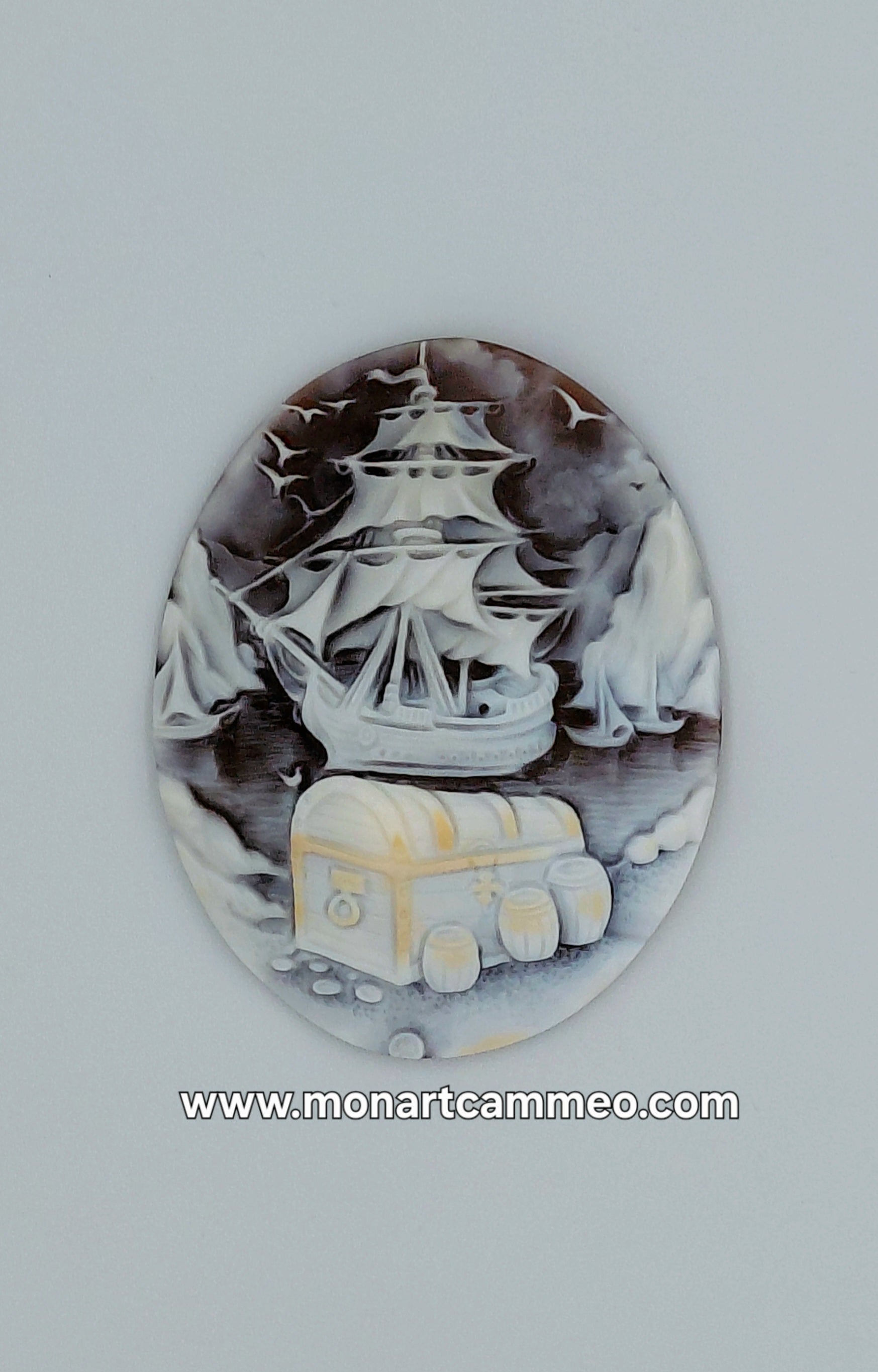 Cammeo artigianale raffigurante un veliero con tesoro, intagliato con maestria su pregiata conchiglia sardonica. Ogni dettaglio di questa opera d'arte miniaturistica è realizzato secondo l'antica tradizione dell'intaglio italiano, rendendo ogni pezzo un esemplare unico di elevato valore artistico. La colorazione naturale della sardonica conferisce profondità e carattere all'incisione, esaltando la scena marinaresca rappresentata.Misura 65/50mm forma ovale